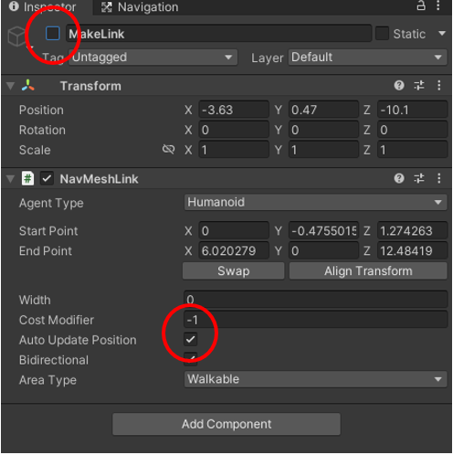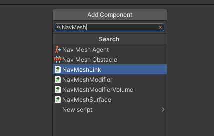 MakeLink를 클릭한 후 AddComponent를 클릭하고 NavMeshLink 를 클릭해주세요