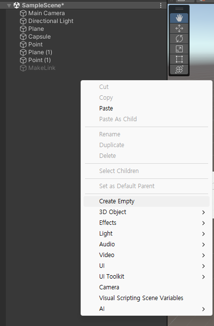 다음으로 Hierachy 에 있는 빈공간 우클릭 후 빈 게임오브젝트를 만들어 주겠습니다. 이름은 MakeLink로 하겠습니다.
