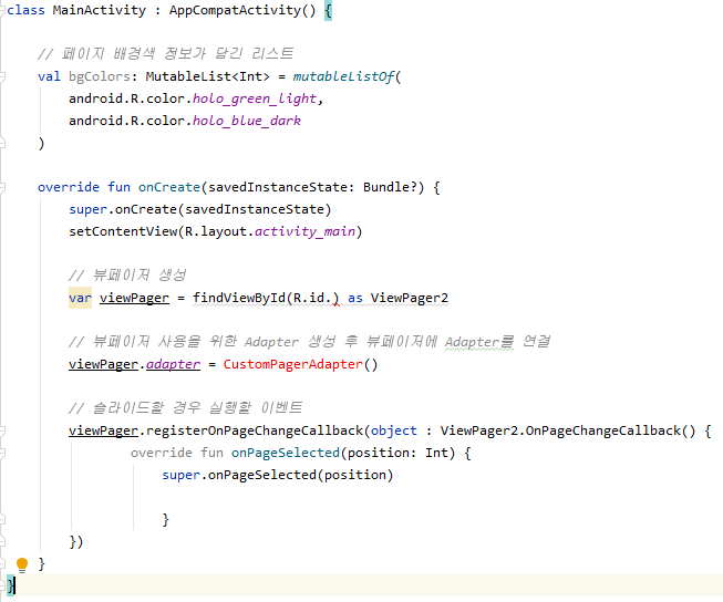 먼저 페이지마다 배경색을 다르게 보여주기위해 색 정보가 담긴 리스트값을 MainActivity 클래스에 추가해줍니다.