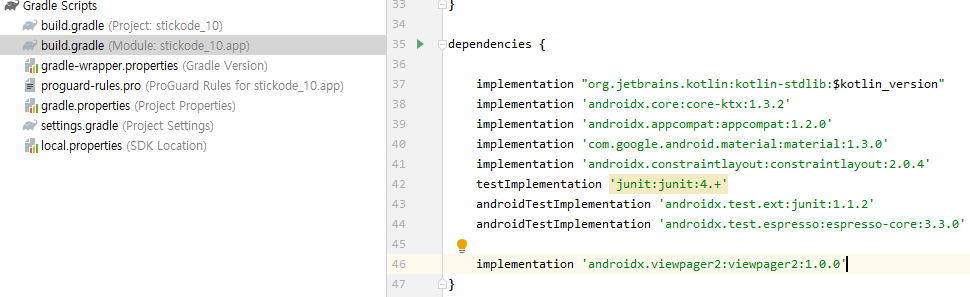 뷰페이저를 사용하기 위해 맨 아래에 보이는 의존성 설정을 추가 해주고, sync Now를 누르면 라이브러리 추가가 완료됩니다.