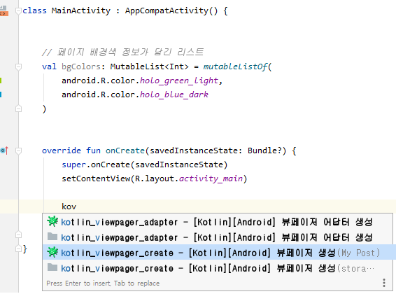 스틱코드를 활용한다면, 클래스에서 'koa' 까지만 작성했을 때 '뷰페이저 어답터 생성' 이벤트가 나타납니다.