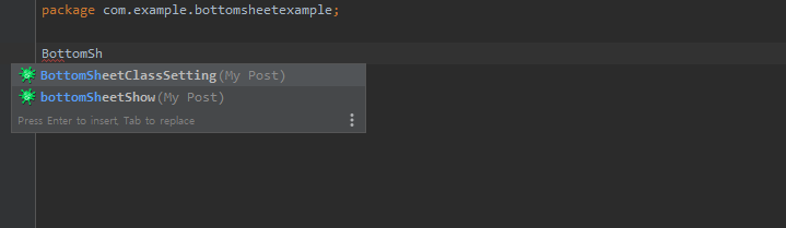 이것들을 한번에 설정해주는 스틱코드를 사용하여 빠르게 ExampleBottomSheetDialog를 셋팅해보도록하겠습니다.