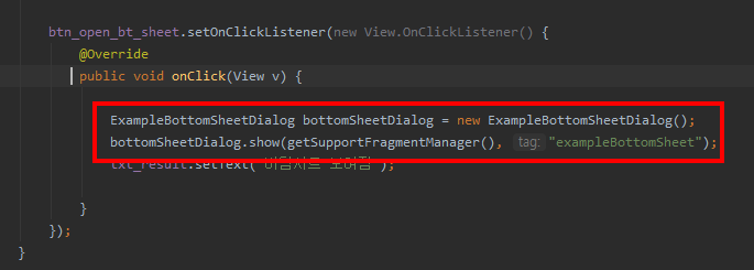 bottomSheetDialog.show(getSupportFragmentManager(), "exampleBottomSheet");
