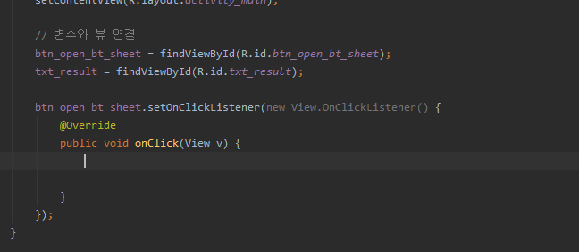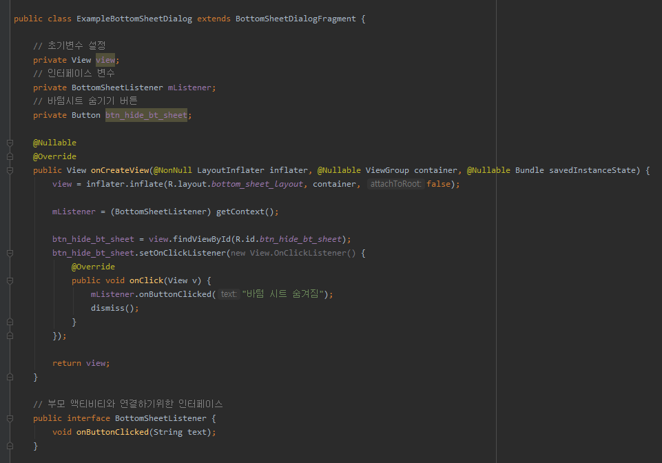 이제 메인 액티비티에서 인터페이스를 통해 바텀시트 프래그먼트와 연결해
