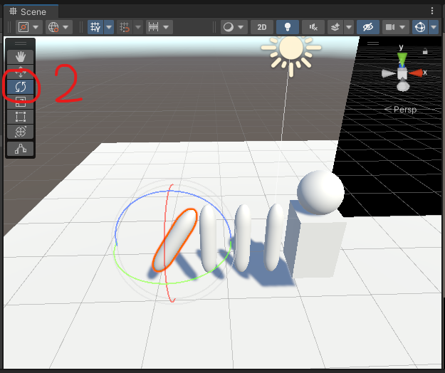그 다음 Scene 창에서 오브젝트를 클릭한 뒤 1번에 표시된 버튼을 눌러 위치를 변경하고 2번에 표시된 버튼을 눌러 오브젯트를 원하는 방향으로 회전할 수 있습니다.