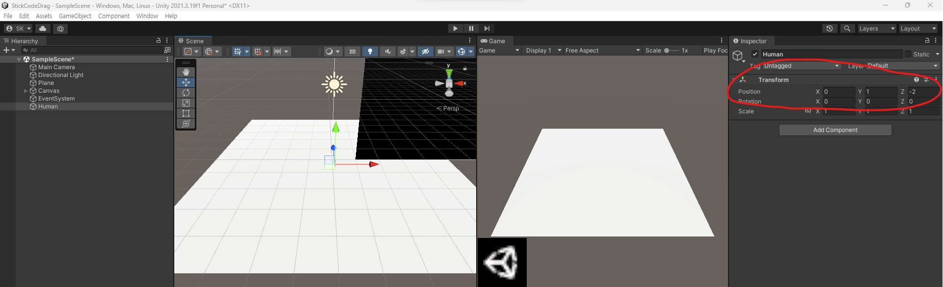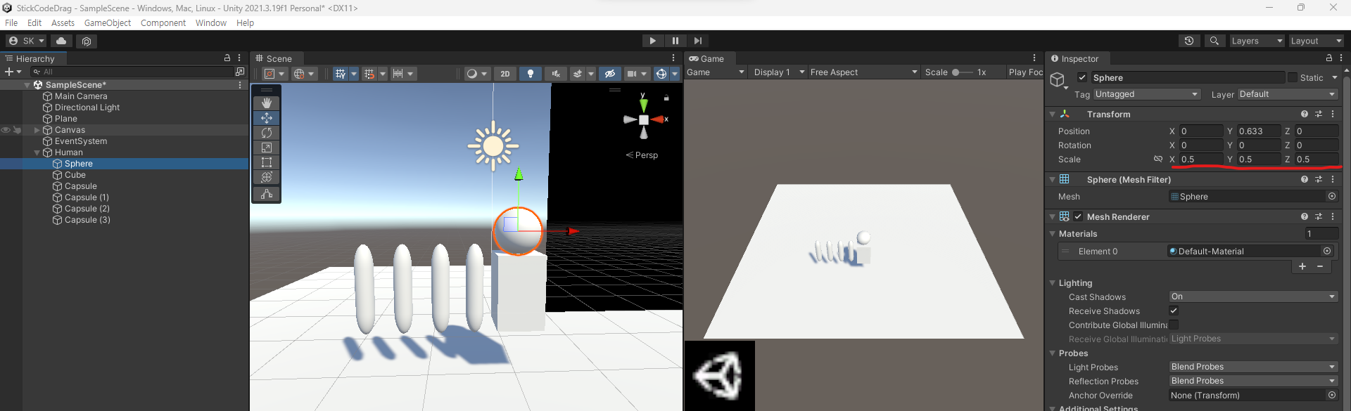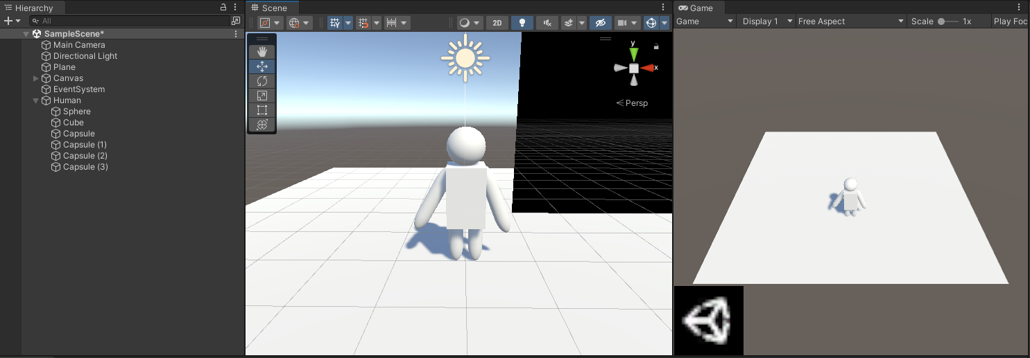 지금부터는 Human을 만들기 위해 이전에 했던 과정을 전부 생략하고 Prefabs 폴더에서 Human을 드래그해 Scene으로 옮기기만 하면 아래 영상처럼 Human 오브젝트를 생성할 수 있습니다!