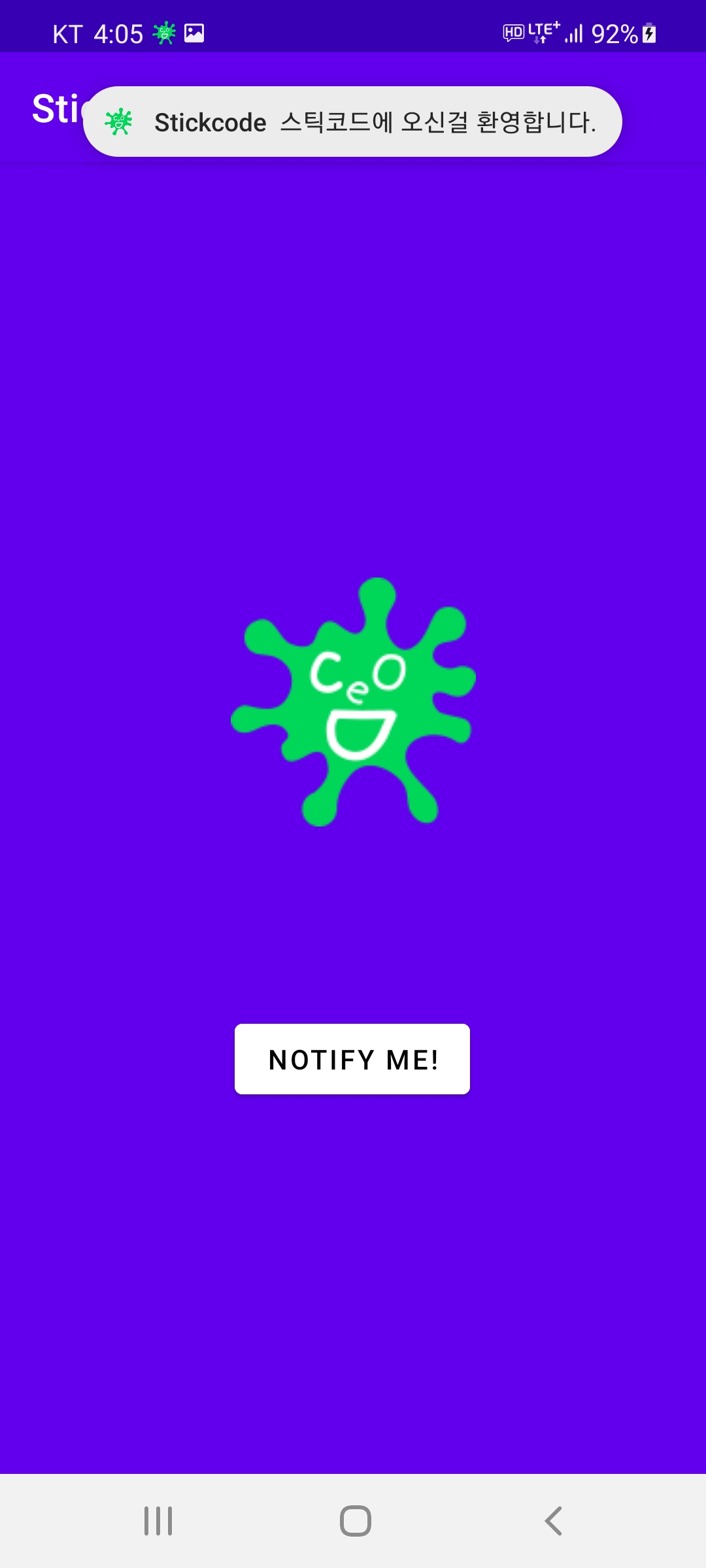.setContentText("스틱코드에 오신걸 환영합니다.")