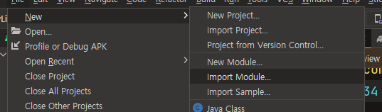 File -> Import Module을 클릭하고 aar파일이 들어있는 프로젝트 폴더를 클릭합니다.