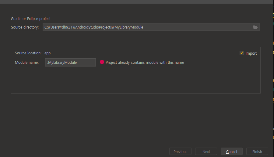 이름을 짓고 Import를 클릭합니다.(예제에선 MyLibraryModule) 로 설정했습니다.