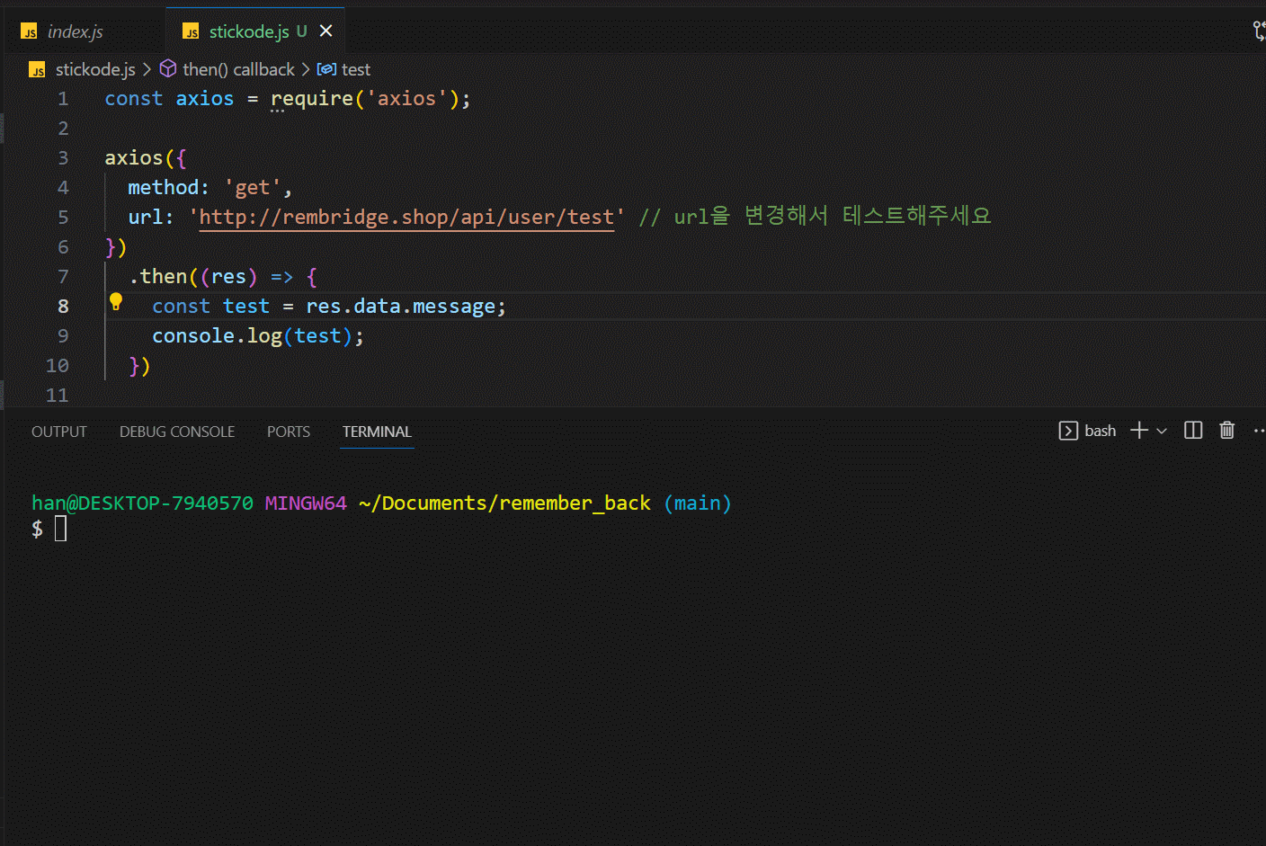 url: 'http://rembridge.shop/api/user/test' // url을 변경해서 테스트해주세요