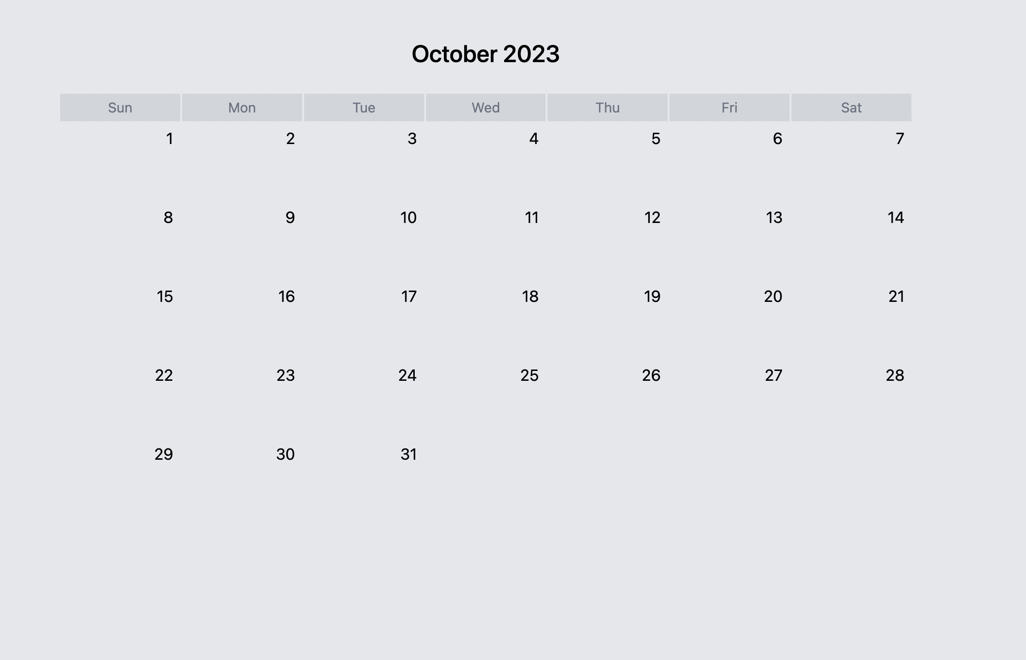 <title>October 2023 Calendar with TailwindCSS</title>