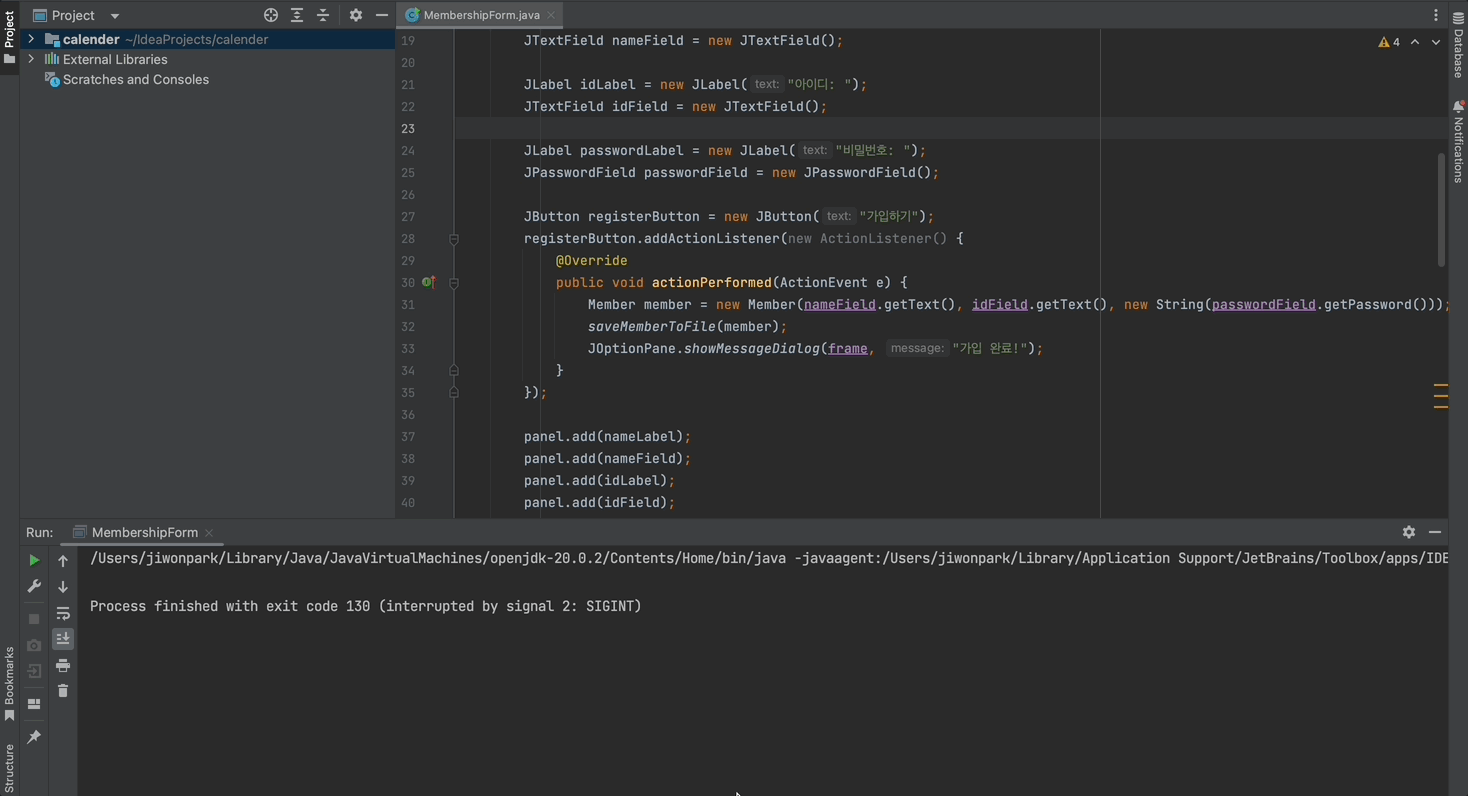 그리고 회원 가입 버튼을 눌렀을 때 호출되는 코드를 다음과 같이 수정합니다.