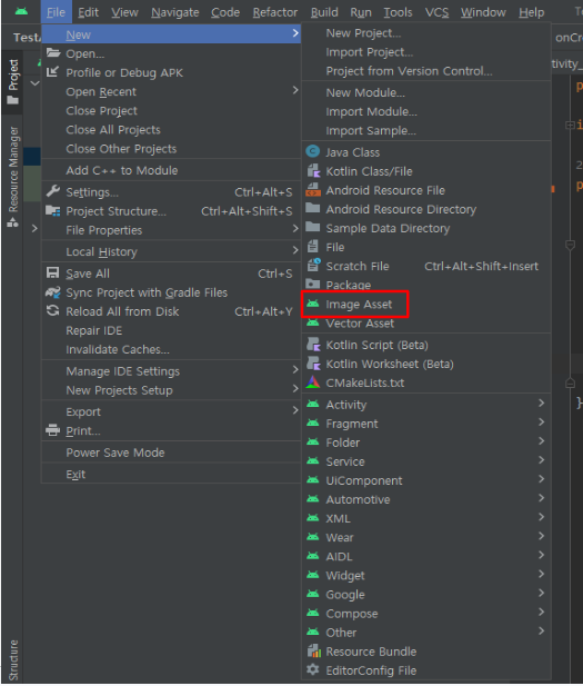 안드로이드 스튜디오에서 File => New => Image Asset 클릭
