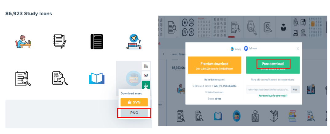 원하는 아이콘을 선택하고 PNG 클릭 -> Free Download 클릭