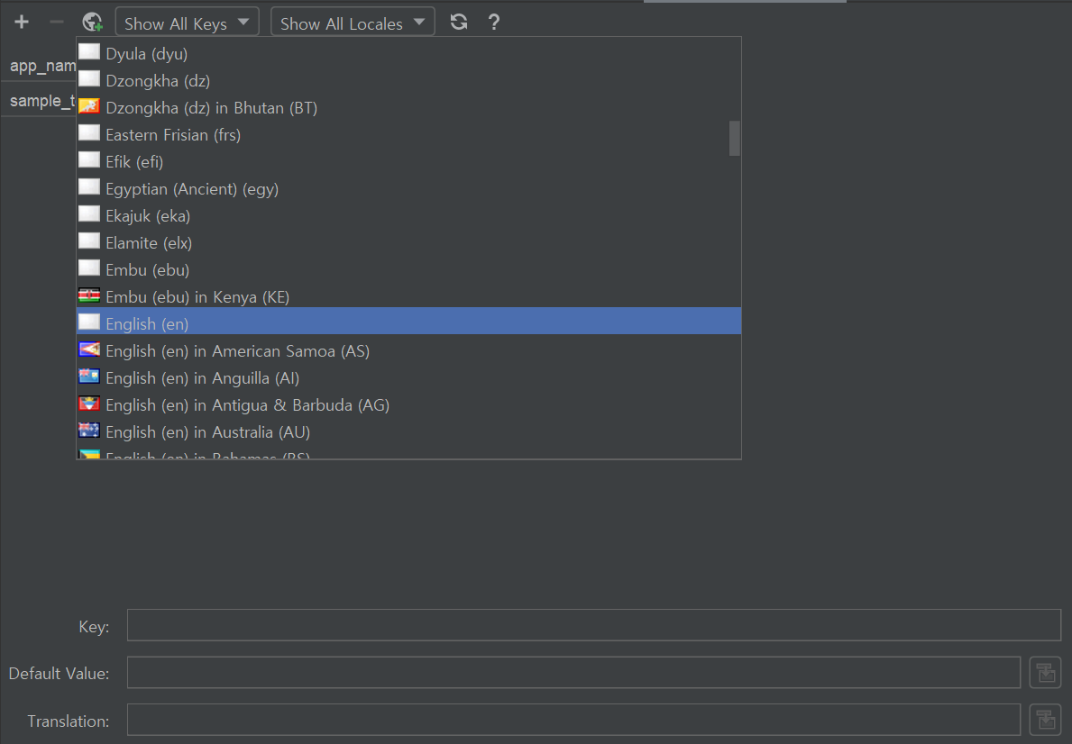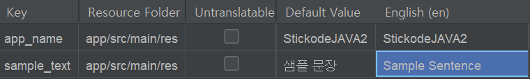 위의 작업을 통해, 앱 언어가 한글일 경우 '샘플 문장'이, 영어일 경우 'Semple Sentence'가 보이도록 해줄 수 있습니다.