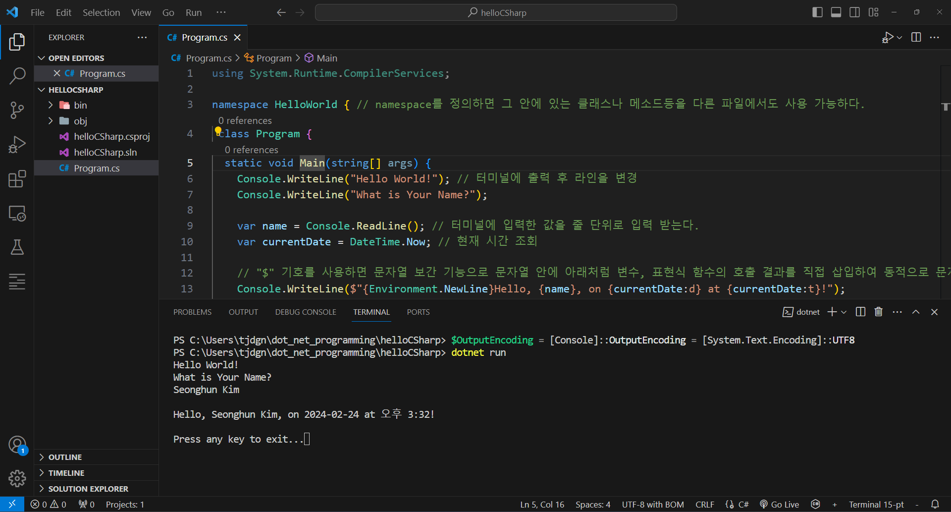 현재 상태에서 터미널에 "dotnet run" 명령어를 입력하고 엔터를 치면 현재 파일을 Top-level statements를 작성한 파일로 인식해 main method 없이도 실행하게 됩니다.