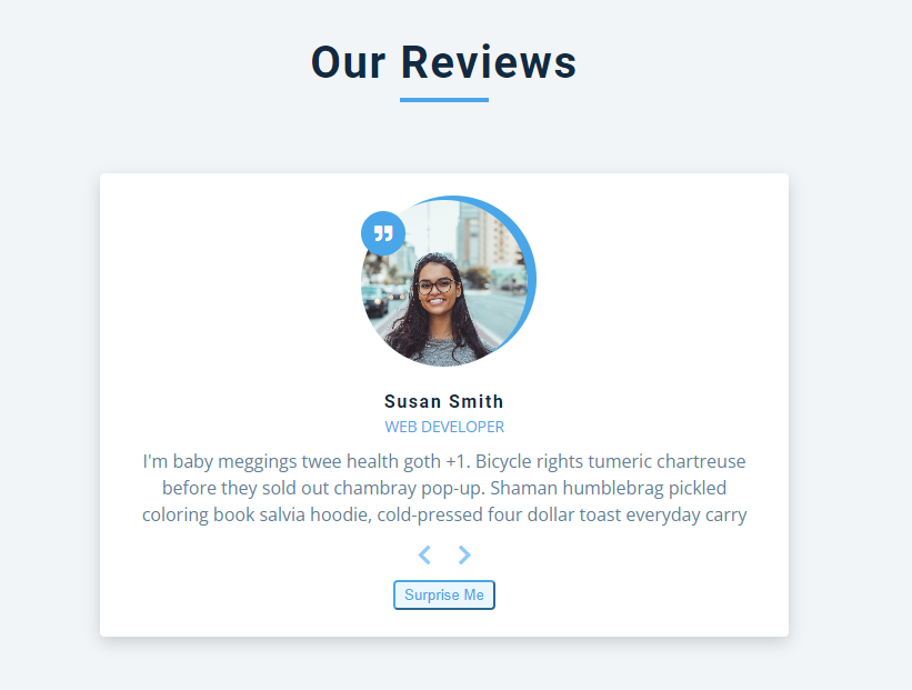 1. reviews 배열은 리뷰 데이터를 저장합니다. 각 리뷰는 사람의 이름, 직업, 이미지 URL, 그리고 리뷰 텍스트를 포함하는 객체입니다.