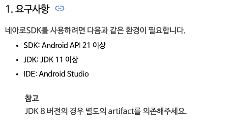 우선 네아로 SDK를 사용하기 위한 요구사항은 다음과 같습니다.