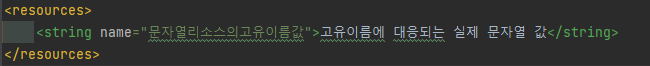 <string></string>: 안드로이드 xml 파일에서 단일 문자열 리소스임을 나타내는 태그입니다. 태그 사이에 보여주고자하는 문자열 값을 넣습니다.
