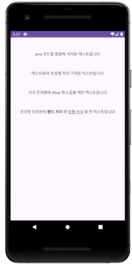 <string name="text_example4">문자열 일부분에 <b>볼드 처리</b>와 <u>밑줄 처리</u>를 한 텍스트입니다</string>