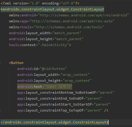 이제, 버튼을 클릭했을 때, 토스트가 나올 수 있도록 Toast 코드를 추가합니다.