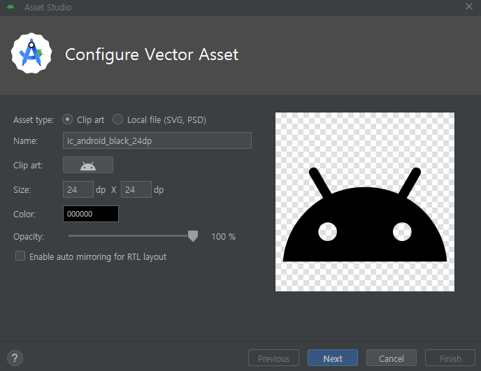 => android studio 내에 있는 Asset Studio의 Configure Vector Asset 기능을 활용하였습니다.