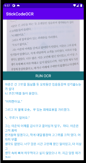 ▶ 필요한 샘플 이미지 파일과 언어 데이터를 OCR 모듈에 세팅해줍니다. 그리고 MainActivity 아래쪽에 스틱코드를 이용해서 OCR 동작 기능을 추가해줍니다.