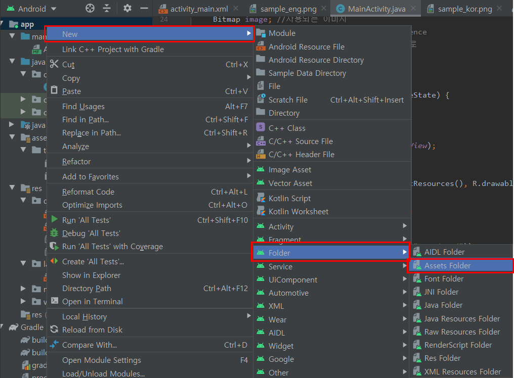 ▶ 필요한 샘플 이미지 파일과 언어 데이터를 OCR 모듈에 세팅해줍니다. 그리고 MainActivity 아래쪽에 스틱코드를 이용해서 OCR 동작 기능을 추가해줍니다.
