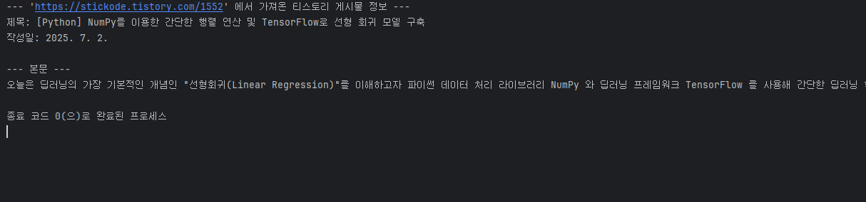 print(f"--- '{url}' 에서 가져온 티스토리 게시물 정보 ---")