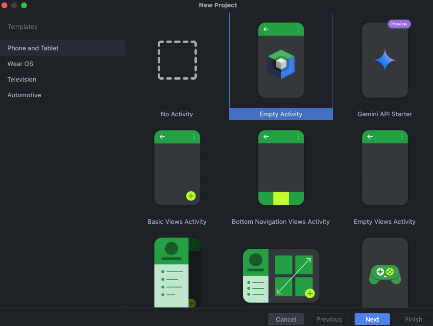 - Empty Activitiy 선택 : Compose 의존성이 적용된 채로 Kotlin 프로젝트가 생성됩니다.
