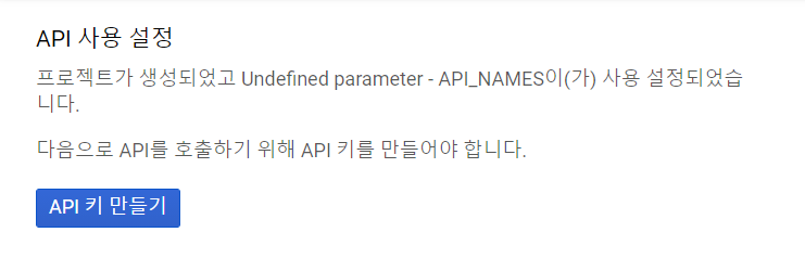 자동으로 프로젝트가 생성되고 API 사용 설정 화면으로 이동하게 됩니다. API를 호출하기 위해서 [API 키 만들기] 버튼을 클릭해줍시다.