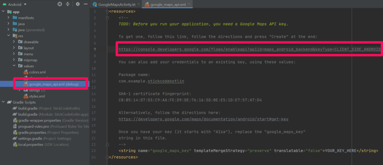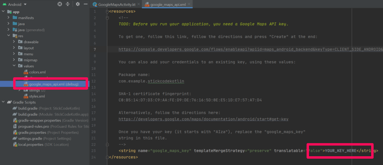 그리고 발급 받은 키를 구글 google_maps_api.xml에서 '.YOUR_KEY_HERE' 부분에다 붙여 넣어 줍시다.