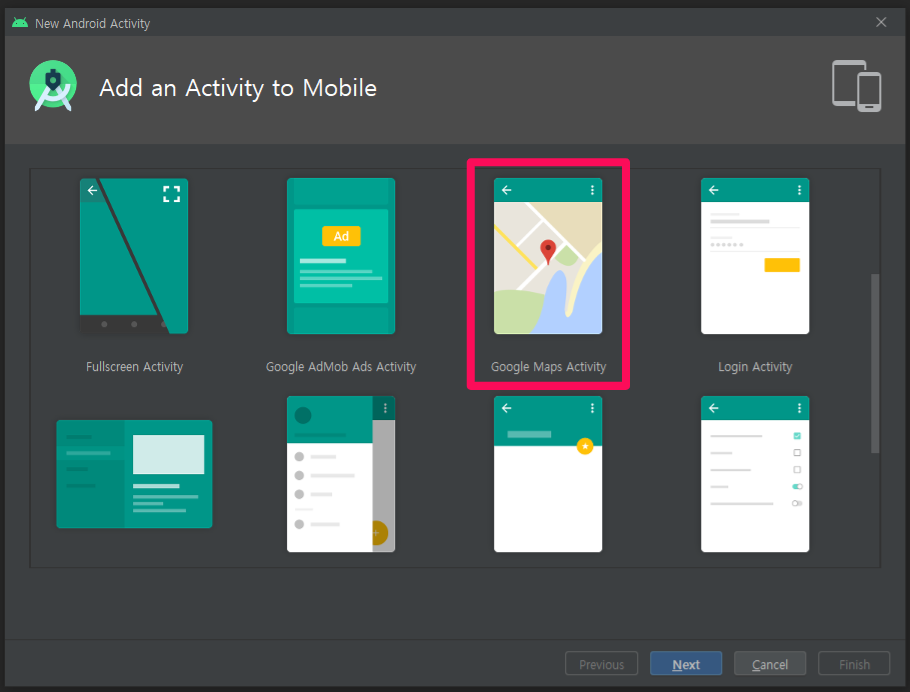이번에는 구글 맵 Activity를 사용하겠습니다. 파일 이름은 GoogleMapsActivity으로 하겠습니다.
