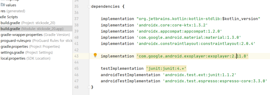 먼저, build.gradle 파일 안에 ExoPlayer 라이브러리를 사용하기 위해 아래 화면처럼