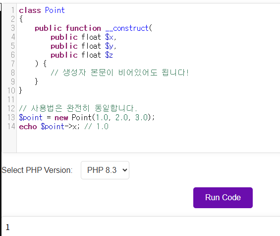 위 코드를 보면, $x, $y, $z라는 이름이 각각 3번씩 반복해서 나타납니다. 속성 선언 (public float $x;) 생성자 매개변수 (float $x) 값 할당 ($this->x = $x;) 이는 코드를 길고 지루하게 만들며, 속성을 하나 추가하거나 제거할 때 여러 곳을 수정해야 하는 번거로움이 있었습니다.