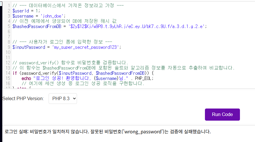 주의: 절대 if (password_hash($input, ...) == $dbHash) 와 같이 비교하면 안 됩니다. password_hash()는 매번 다른 해시를 생성하므로 항상 false가 나옵니다. 또한, == 연산자는 타이밍 공격(Timing Attack)에 취약할 수 있습니다. 반드시 password_verify()를 사용해야 합니다.