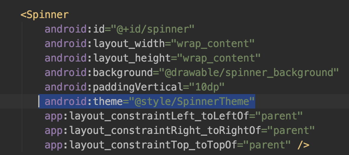 스피너에 theme이라고 입력한 후에, 방금 전 추가했던 SpinnerTheme을 넣어주면 끝입니다.