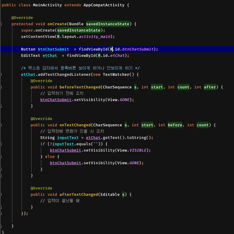 입력란에 변화가 있을 때(onTextChanged) : 전송버튼이 보이게
