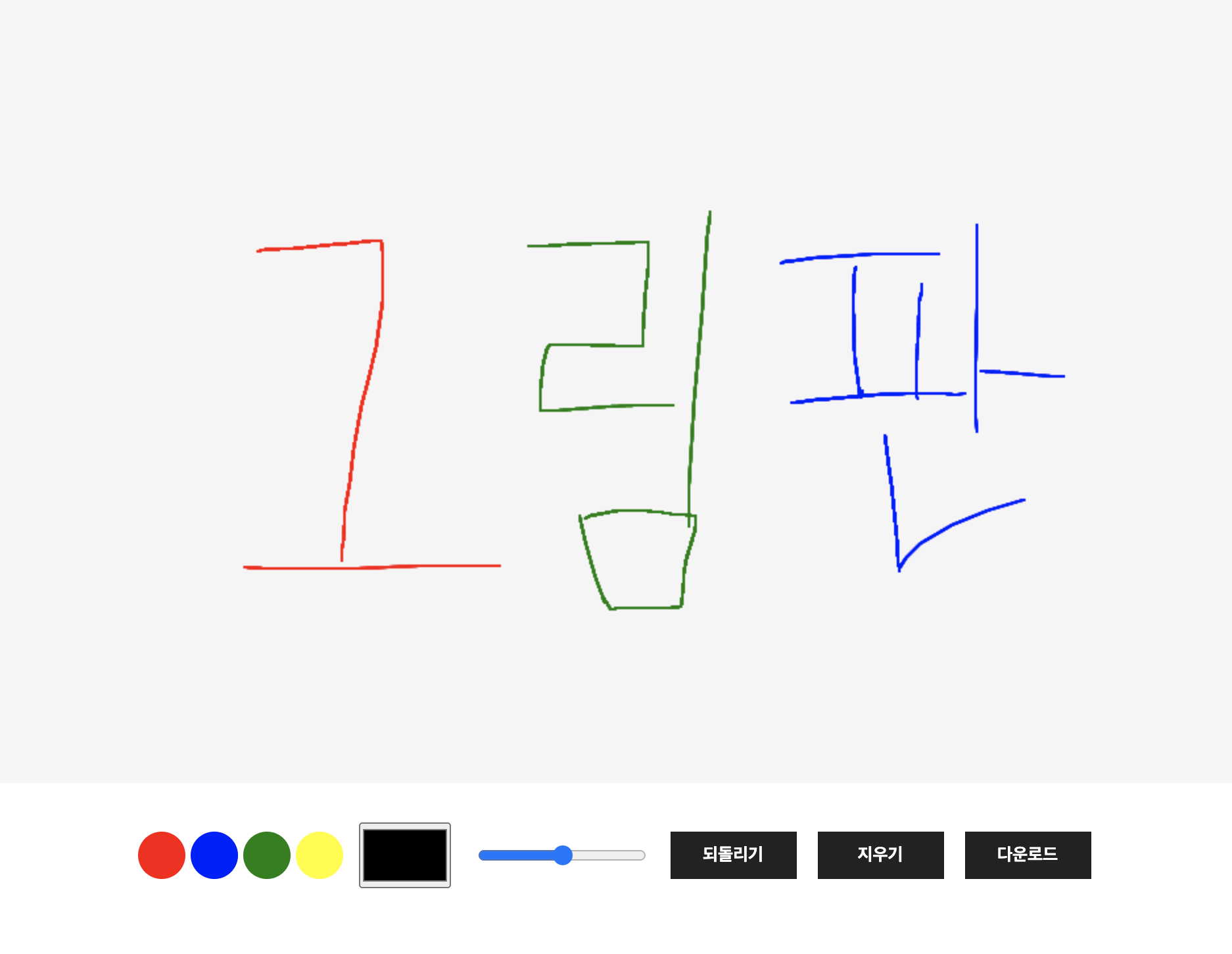 그림판영역, 컬러칩, 컬러피커, 펜굵기조절, 버튼(되돌리기, 지우기, 다운로드)을 만듭니다.