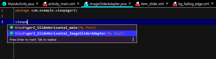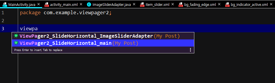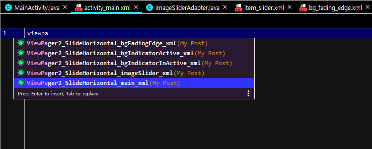 viewpager2 태그를 입력하면 스틱코드 탭이 생성되고