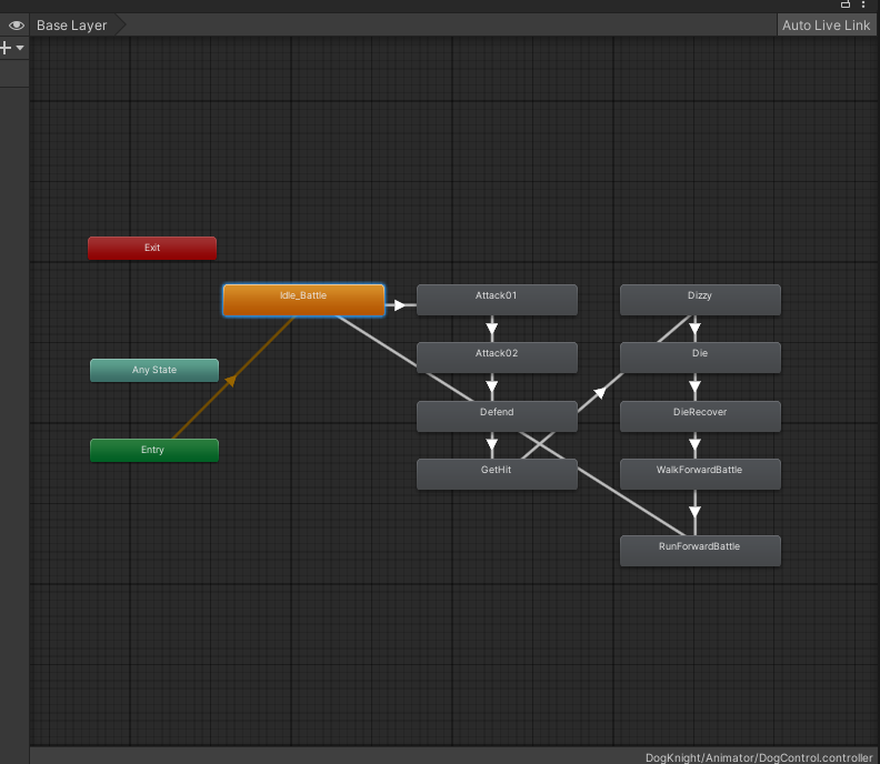 설정은 아래 오른쪽 화면과 같이 바꿔주세요. Idel_Battle 에서 RunForwardBattle 로 화살표를 추가하는 방법은 Idel_Battle 에서 우클릭 후 Make Transition 클릭, RunFrowardBattle 을 클릭하시면 됩니다. 삭제는 화살표를 클릭 후 키보드 Del를 누르시면 됩니다.