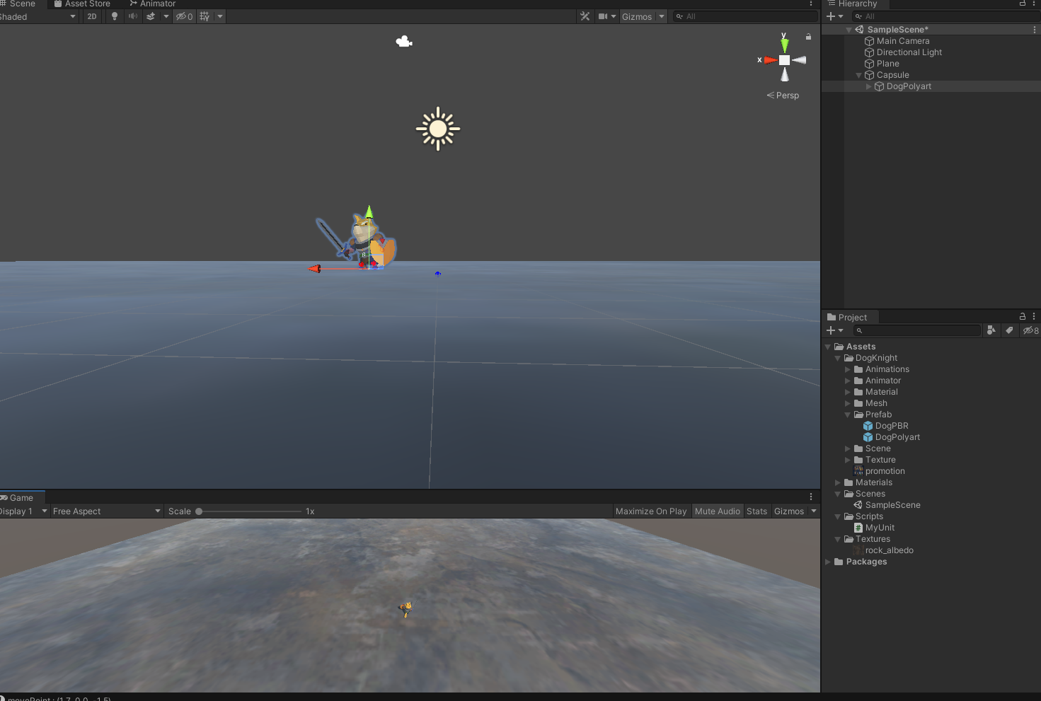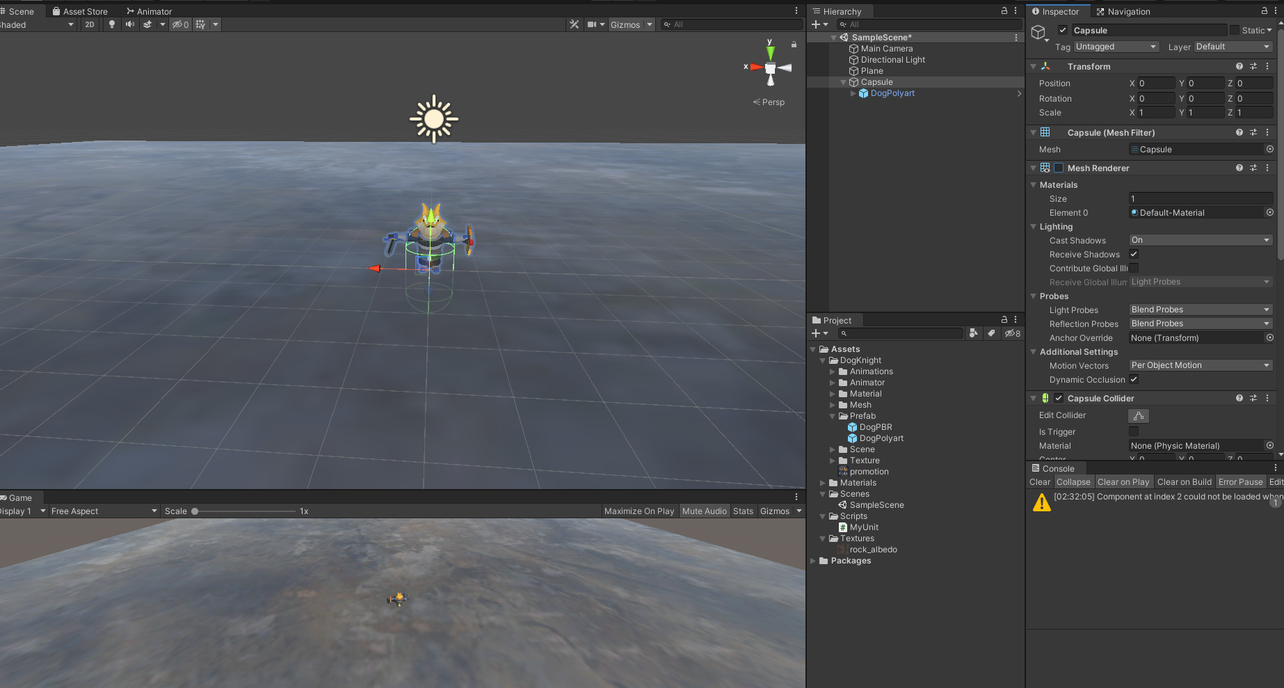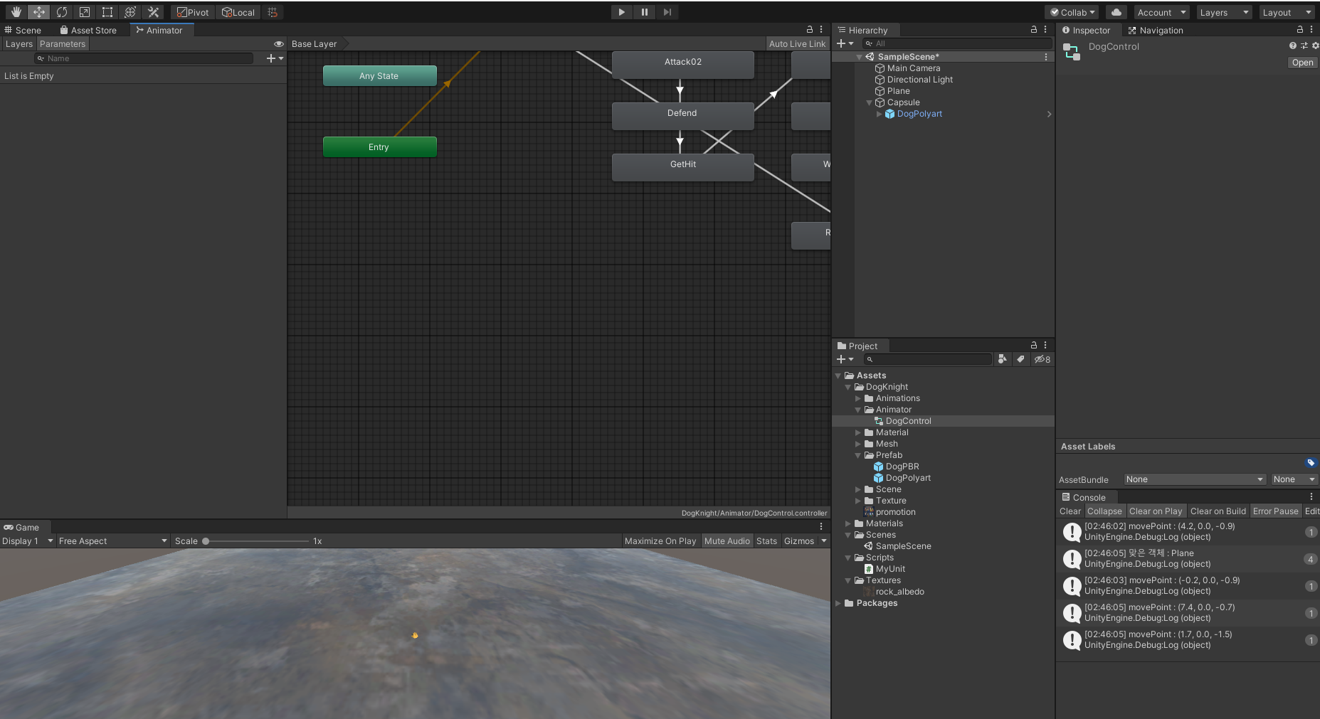 게임을 종료하신 후 Capsule 아래에 있는 DogPolyart 오브젝트의 Position Y 값을 -1 로 바꾸도록 합니다.