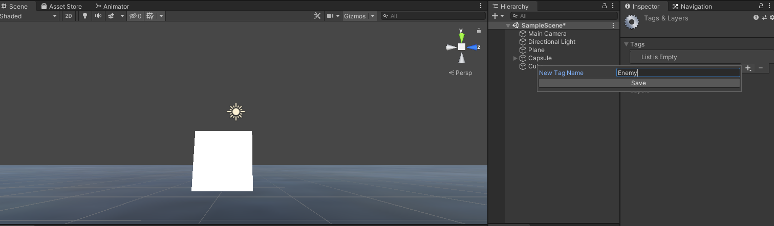 생성한 큐브와 바닥이 클릭됐을 때를 구분하기 위해서 태그를 설정해줍니다.