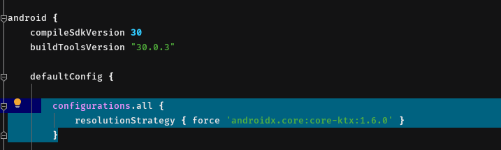 resolutionStrategy { force 'androidx.core:core-ktx:1.6.0' }