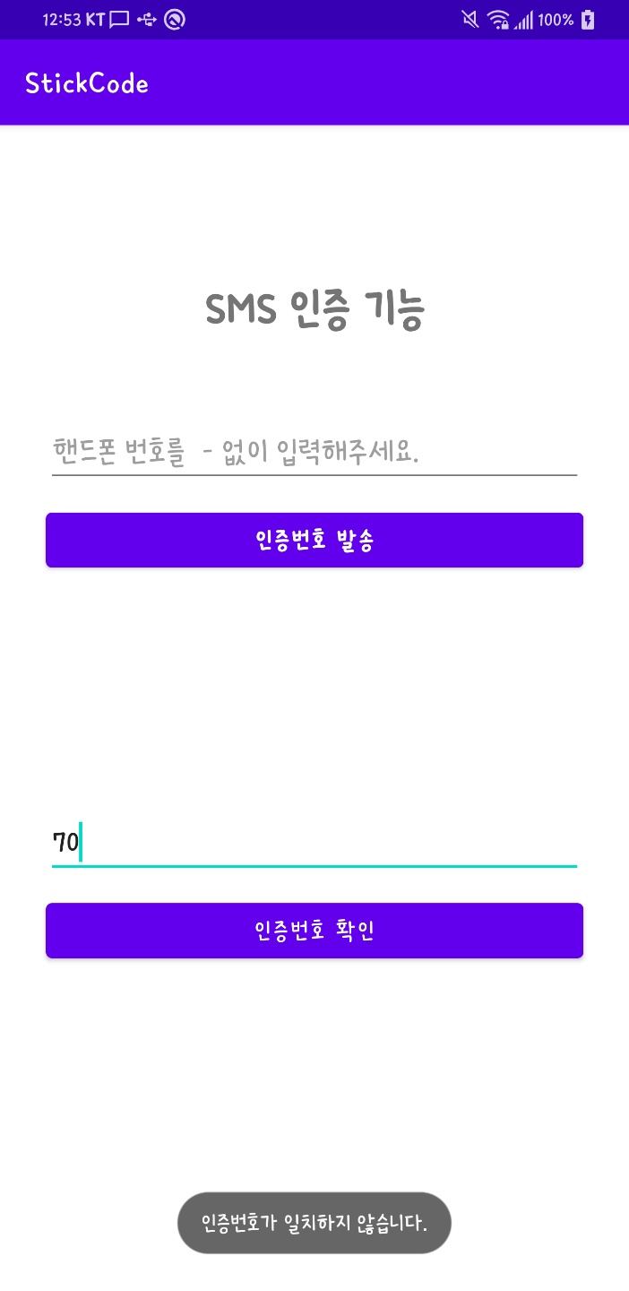 ▶ 저장된 인증번호와 입력한 인증번호를 체크한 결과값을 토스트메세지를 이용해 띄워줍니다.