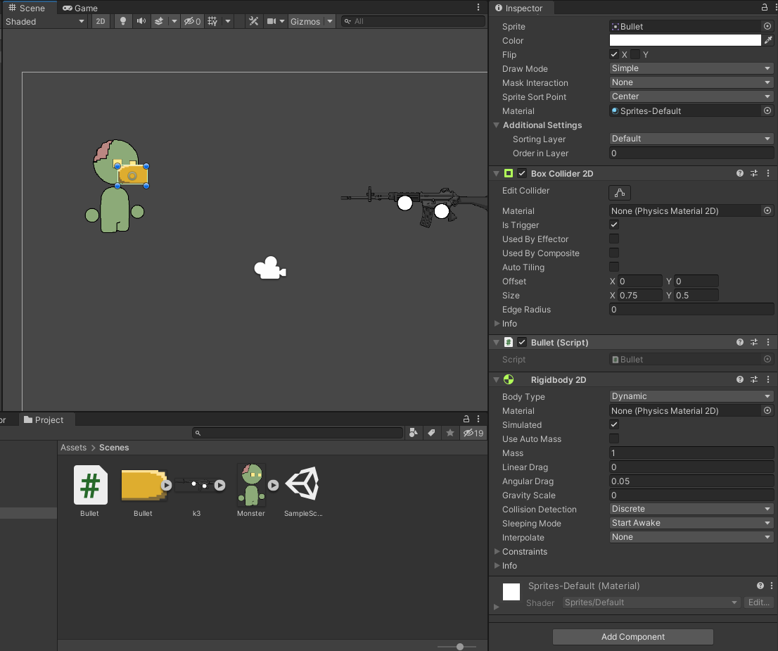 그 다음 Bullet의 이름을 가진 스크립트를 하나 만들어주고, 총알에 Box Collider 2D 컴포넌트와 Rigidbody 2D 컴포넌트를 붙여줍니다.