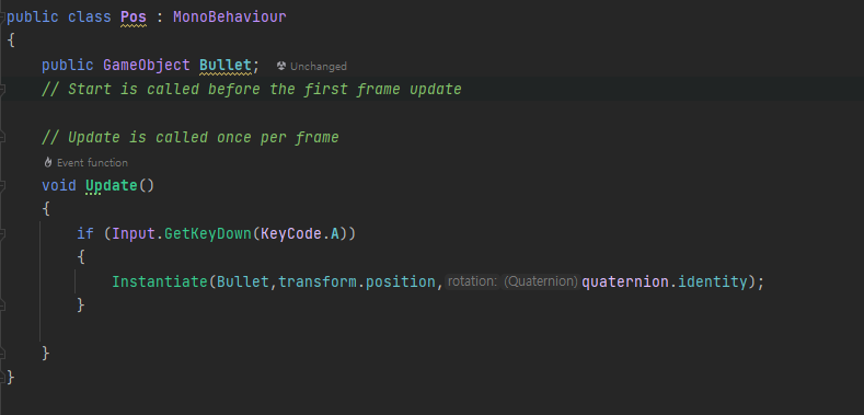 A버튼을 누를시, 총알이 생성되어 왼쪽으로 날아가는 스크립트입니다.