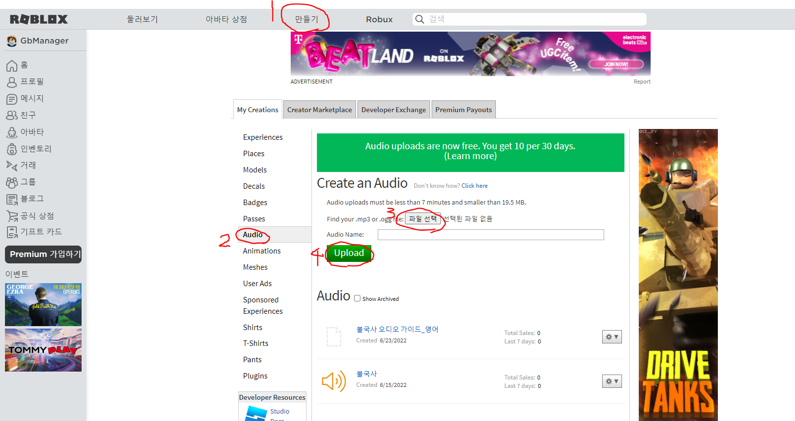 [로블록스 홈페이지] -> [만들기] -> [Audio 클릭]