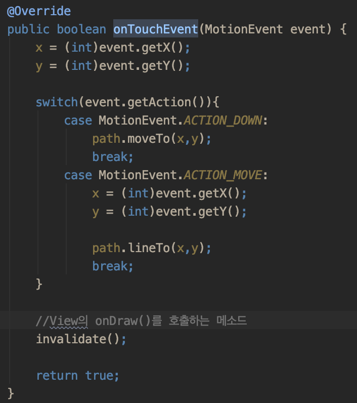 마지막에 invalidate() 메소드로 위에 작성된 onDraw를 호출합니다.