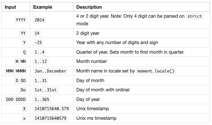 Format Dates moment().format('MMMM Do YYYY, h:mm:ss a'); moment().format('dddd'); moment().format("MMM Do YY"); moment().format('YYYY [escaped] YYYY'); moment().format(); Relative Time moment("20111031", "YYYYMMDD").fromNow(); moment("20120620", "YYYYMMDD"